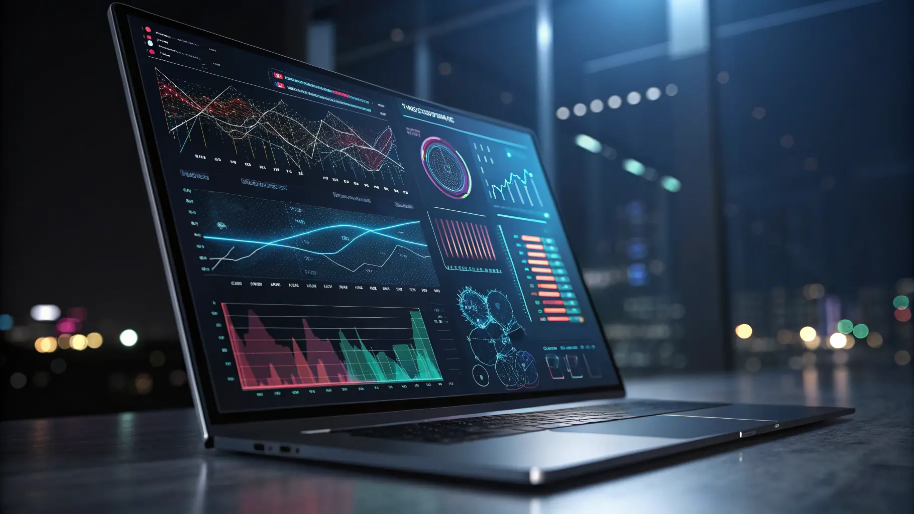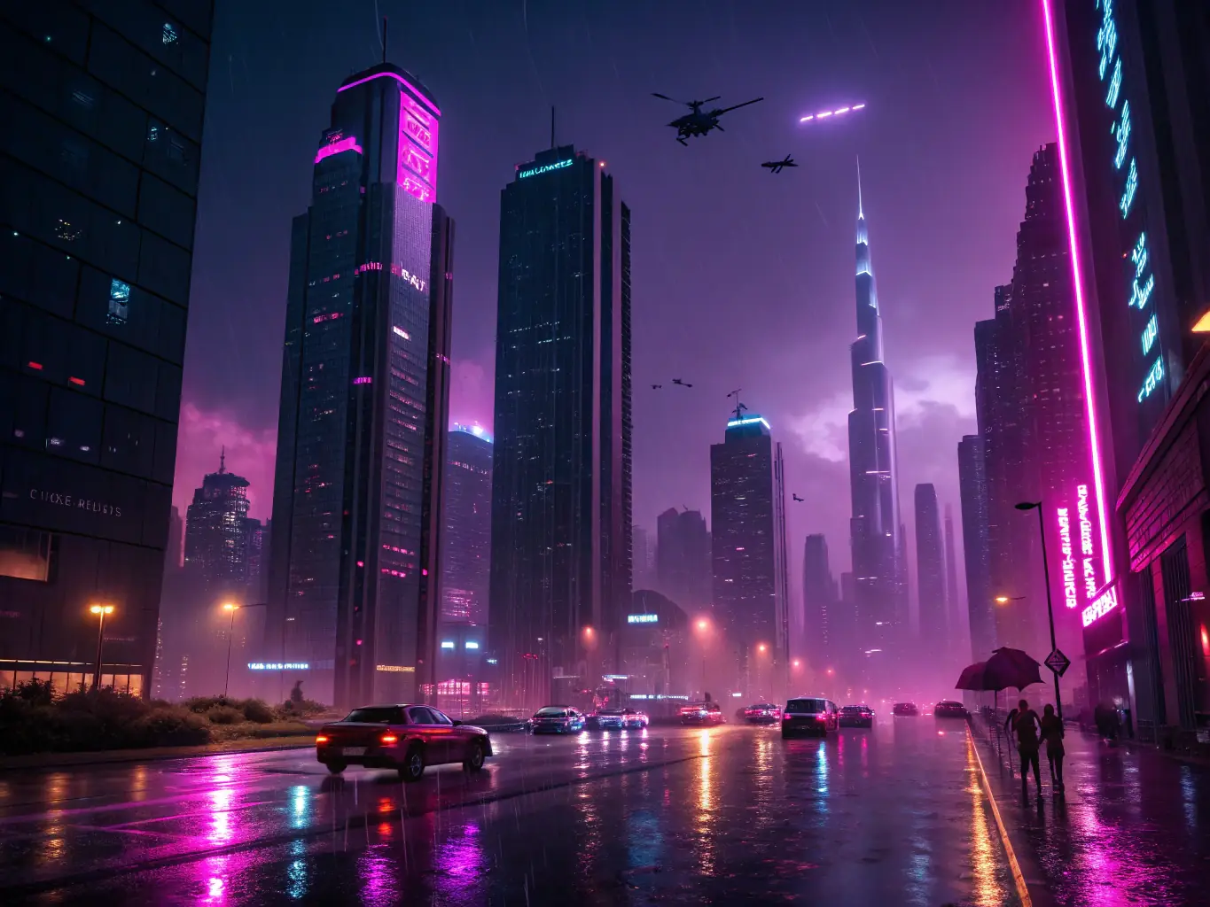 融合了赛博朋克和未来主义建筑的动态城市天际线。